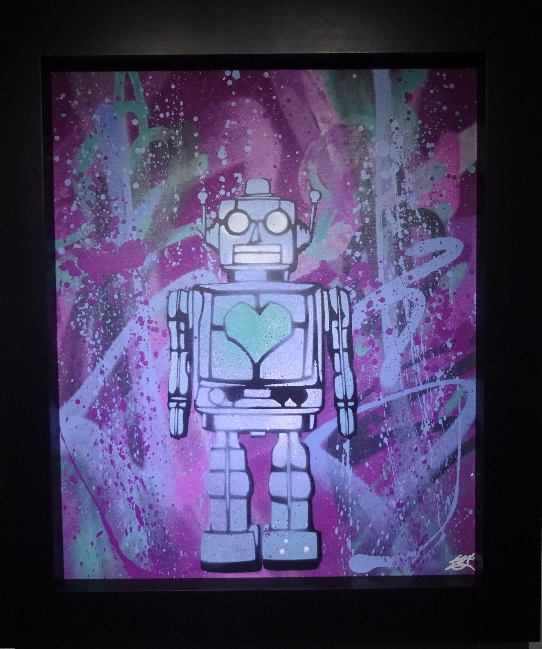 This is a framed original painting with aerosol and acrylic on canvas. 455mm x 560mm (size of artwork unframed)